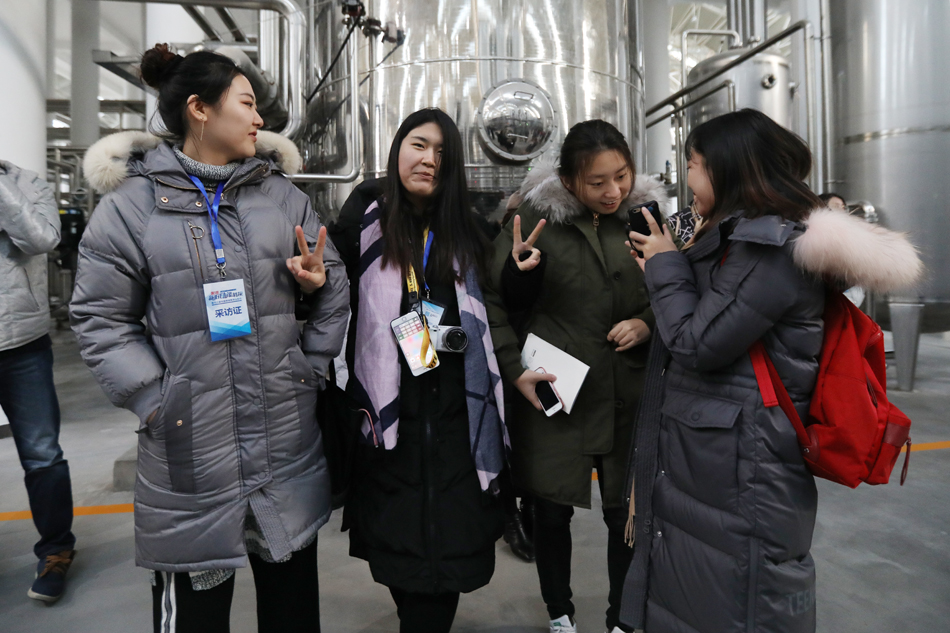 在張?jiān)H葡萄酒城的生產(chǎn)車間,記者在對(duì)著鏡頭做手勢。