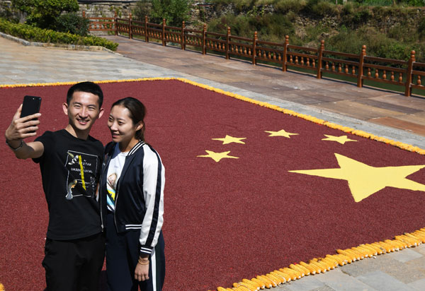 10月1日,棗莊市山亭區葫蘆套村村民用糧食制作了一面國旗,游客紛紛合影留念。 (李宗憲 攝)