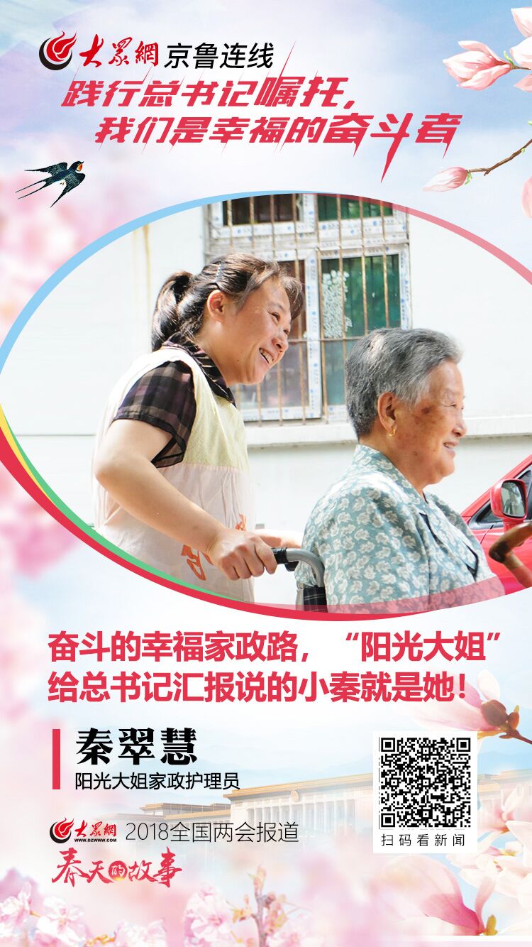 3月8日上午,“陽光大姐”卓長立向習(xí)總書記匯報了養(yǎng)老服務(wù)員小秦“一人就業(yè)全家脫貧”的故事。卓長立說的“小秦”,就是秦翠慧。8日晚,大眾網(wǎng)記者在濟(jì)南陽光大姐總部見到了“小秦”。