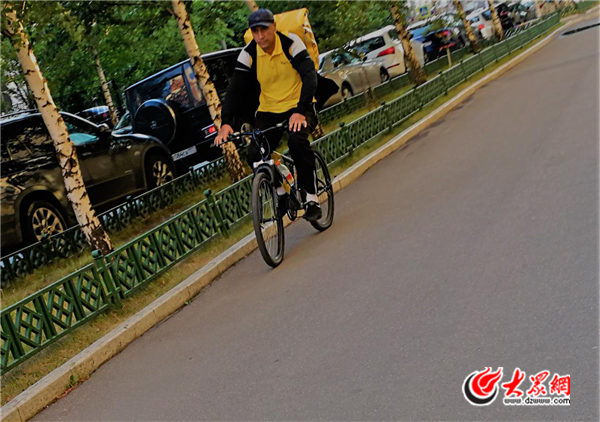 大眾網特派記者注意到,莫斯科的外賣小哥大多是二三十歲的年輕人。上圖中的這個外賣小哥文質彬彬,頗有文藝范兒。他騎著自行車送外賣,恰好來了一路34路公交車,于是他就推著自行車徑直上了公交車,他沒有投幣或刷卡。顯然,外賣公司與公交公司應該有協議的。