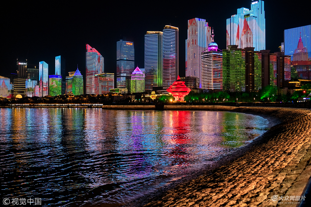 山東青島,上合青島峰會(huì)之五四廣場(chǎng)夜景燈光秀。