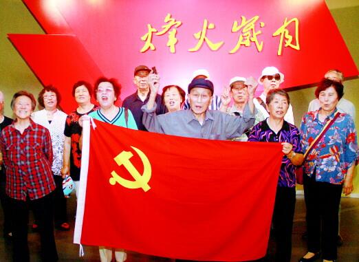 殷樹山夫婦(前排中為殷樹山,左一為劉彩鳳)組織社區黨員進行革命傳統教育。