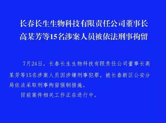 7月24日,長春長生生物科技有限責(zé)任公司董事長高某芳等15名涉案人員因涉嫌刑事犯罪,被長春新區(qū)公安分局依法采取刑事拘留強制措施。目前案件相關(guān)工作正在進行中。長春新區(qū)公安分局 [詳細(xì)]
