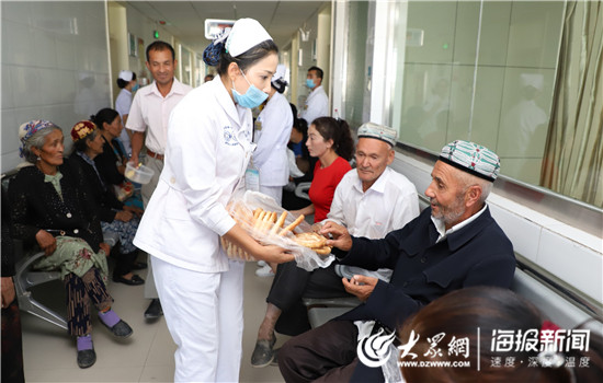 英吉沙縣人民醫院為等待篩查的患者送上當地特色美食—馕,保障篩查工作安全順利開展。(仇晶 攝)