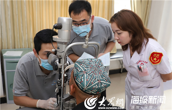 山東大學(xué)第二醫(yī)院眼科醫(yī)生魏超、王合雷與麥蓋提縣人民醫(yī)院醫(yī)生一起檢查患者。(仇晶 攝)