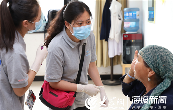 志愿者棗莊市市中區(qū)人民醫(yī)院眼科主任湯靜觀察患者眼部情況。(仇晶 攝)