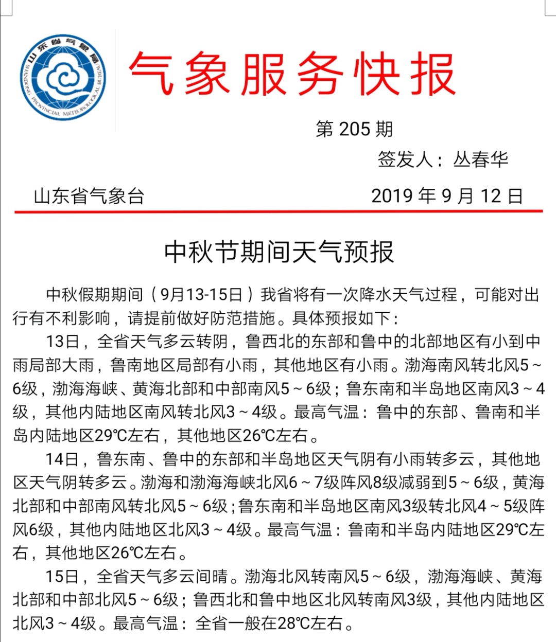 15日,全省天氣多云間晴。渤海北風轉南風5~6級,渤海海峽、黃海北部和中部北風5~6級;魯西北和魯中地區北風轉南風3級,其他內陸地區北風3~4級。最高氣溫:全省一般在28℃左右。