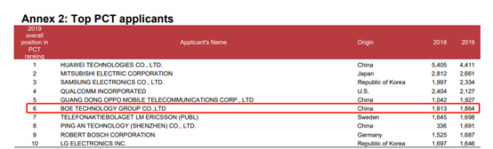 4月7日,世界知識產權組織(WIPO)公布了2019年全球國際專利申請排名情況,其中BOE(京東方)位列全球第六,擁有 1864件《專利合作條約》(PCT)框架下的國際專利申請量。