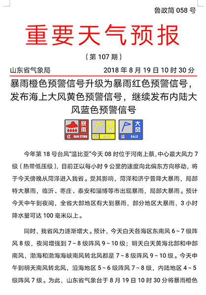 最新情況!據(jù)山東省氣象臺(tái)最新暴雨紅色預(yù)警,今年第18號(hào)臺(tái)風(fēng)“溫比亞”今天08時(shí)位于河南上蔡,中心最大風(fēng)力7級(jí)(熱帶低壓級(jí)),目前正以每小時(shí)9公里的速度向北偏東方向移動(dòng),將于今天傍晚從菏澤進(jìn)入山東省。受其影響,菏澤和濟(jì)寧普降大暴雨,局部特大暴雨,臨沂、棗莊、泰安和淄博等市出現(xiàn)暴雨,局部大暴雨。預(yù)計(jì)今天中午到夜間,全省大部地區(qū)有大到暴雨,部分地區(qū)大暴雨,3小時(shí)降水量可達(dá)100毫米以上。為此,山東省氣象臺(tái)于8月19日10時(shí)30分將暴雨橙色預(yù)警信號(hào)升級(jí)為暴雨紅色預(yù)警信號(hào)。提醒大家做好防雨防汛措施!
