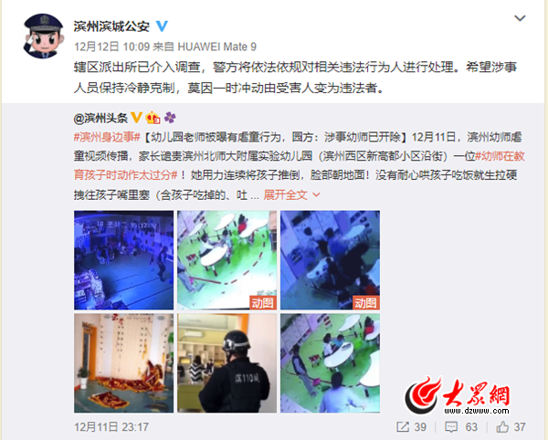 警方通報稱, 2018年12月11日警方接群眾舉報介入調查的濱州市濱城區某民辦幼兒園幼師毆打幼童案現已查明。