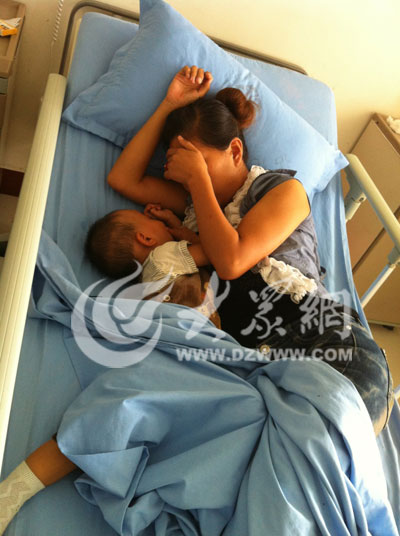 被打婦女張某和孩子躺在醫院的病床上。