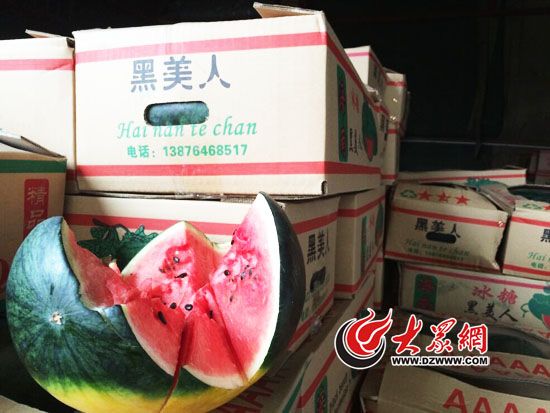 2日下午,大眾網記者來到位于濟齊路的某大型水果批發市場,五個水果銷售大棚中,有兩個大棚聚集著近30個西瓜銷售攤點,每個攤點都堆積著滿滿當當的西瓜。記者看到,很多西瓜包裝印有“黑美人”字樣。