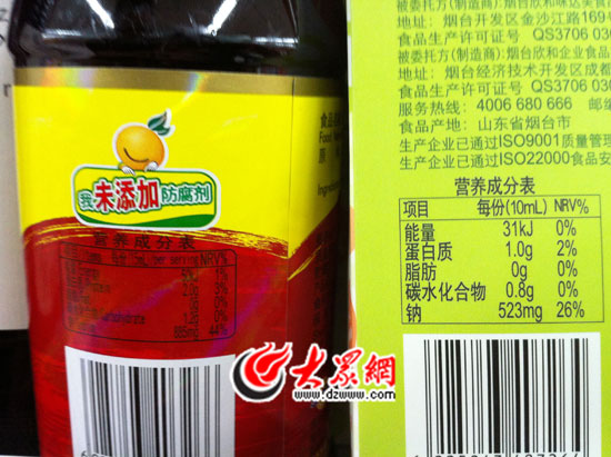 先以這款超市中賣相較好的魯能雅地兒童面條為例,大眾網記者仔細進行了對比:兩種面條,每100克中,所含能量同為1352千焦,蛋白質同為10.1克,脂肪同為1.3克,碳水化合物同為6.6克,鈉同為399毫克。生產標準號完全相同,生產許可證完全相同,配料完全相同,保質期也完全相同,都是12個月。兩種欣和醬油,兒童款的每10毫升中,所含能量為31千焦,鈉523毫克,碳水化合物0.8克;而普通醬油是按每15毫升計量:所含能量為50千焦,鈉825毫克,碳水化合物為1.2克。若換算成同樣單位,營養成分可以說相差無幾,并不存在“兒童醬油比普通醬油含鹽量低多少”的說法。