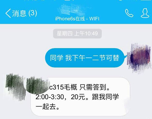 在替課群里非常活躍的潘同學告訴大眾網記者,他從大二開始就幫人替課,一開始是在學校的貼吧里有人發布替課信息就趕緊去回帖,后來就是密切關注各種QQ、微信替課群。“本專業課不多的時候去替課,一個月也能賺將近一千塊錢,覺得這種賺錢方式還挺好的,去坐一節課就把錢賺了,大家各取所需嘛。”小潘說。