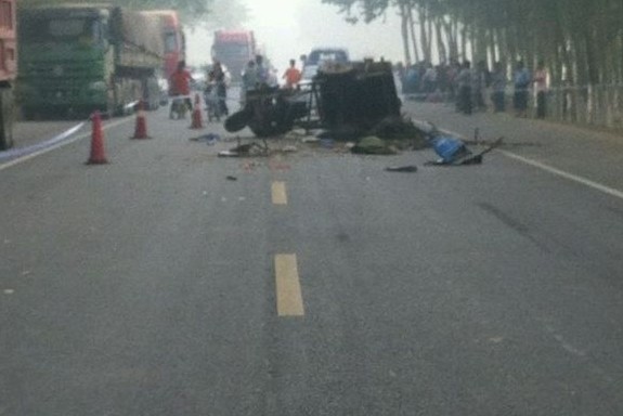5月23日凌晨,今年44歲的成武縣九女集鎮村民賈愛賢,駕駛飛彩牌機動三輪車乘載9人,沿省道348線前往成武縣大田集鎮刨蒜打工,由西南向東北行至成武縣縣城西五岔路口附近時,因大霧與對向駛來的一輛時風牌農用運輸車發生刮擦,致三輪車側翻,車上所載9人中2人當場死亡,7人受傷。
