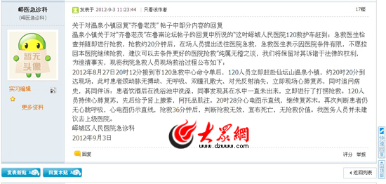 大眾網濟南9月3日訊(記者 盛堃)8月27日晚8時許,棗莊市臺兒莊區張山子鎮私營業主武中國在棗莊仙壇山溫泉小鎮旅游度假酒店(下稱“溫泉小鎮”)的泳池內不幸溺亡。8月31日,大眾論壇內名為“仙壇山溫泉小鎮無溫暖 淹死游客無人管”的帖子將該事件推到風口浪尖(帖文地址:http://bbs.dzwww.com/thread-26640567-1-1.html)。近日,溫泉小鎮在論壇中對該事件作出實名回復;棗莊市嶧城區人民醫院也在論壇中實名發帖,將這場論戰進一步升級。