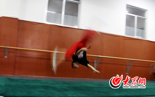 9月21日下午,記者來(lái)到山東省電影學(xué)校的練功房,該校2011級(jí)京劇班的學(xué)生正在上基訓(xùn)課,三個(gè)剛剛?cè)雽W(xué)的2011級(jí)京劇班女生朱釩萌、仉澤宇、楊雨辰正在壓腿,而這三個(gè)女生都是來(lái)自濟(jì)南的。其中,9歲的朱釩萌是育新小學(xué)的,12歲的仉澤宇是千佛山小學(xué)的,11歲的楊雨辰是歷下實(shí)驗(yàn)小學(xué)的,3個(gè)人都考上了山東省電影學(xué)校2011年的京劇班,而她們的目標(biāo)都是——“長(zhǎng)大了考中國(guó)戲曲學(xué)院,成為名角!”