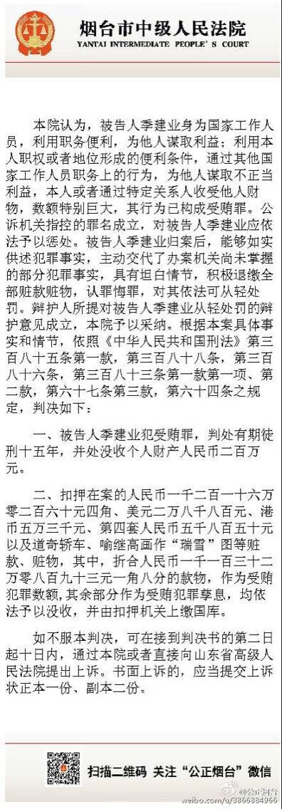 判決情況:季建業(yè)一審被判有期徒刑15年,沒(méi)收個(gè)人財(cái)產(chǎn)200萬(wàn)元