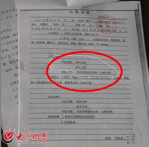 劉朝香隨后向記者出示了醫院的診斷證明,說“這個能證明他左眼是被打瞎的”。大眾網記者看到,這是蒙陰縣中醫院在2012年8月30日出具的病例診斷證明,在入院診斷和出院診斷上,都明確寫著“急性閉角型青光眼(左絕對期)”。