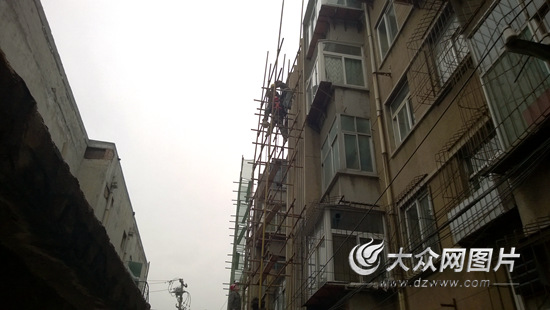 大眾網記者今天上午在現場看到,這棟居民樓第一單元的腳手架已經搭建完畢,幾名工人正在有條不紊地安裝第二單元的腳手架。現場工人告訴大眾網記者,他們是從昨天開始工作的,正在做居民樓維修前的準備。