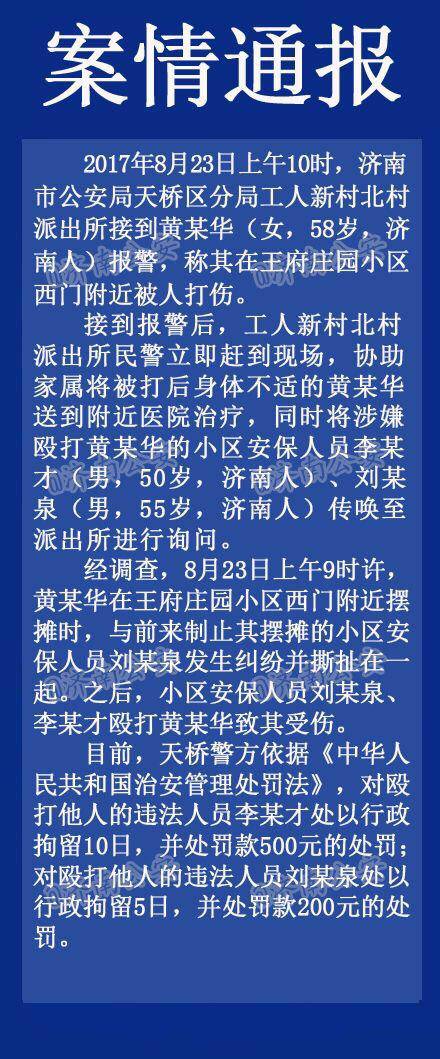 2017年8月23日上午10時(shí),濟(jì)南市公安局天橋區(qū)分局工人新村北村派出所接到黃某華(女,58歲,濟(jì)南人)報(bào)警,稱其在王府莊園小區(qū)西門(mén)附近被人打傷。接到報(bào)警后,工人新村北村派出所民警立即趕到現(xiàn)場(chǎng),協(xié)助家屬將被打后身體不適的黃某華送到附近醫(yī)院治療,同時(shí)將涉嫌毆打黃某華的小區(qū)安保人員李某才(男,50歲,濟(jì)南人)、劉某泉(男,55歲,濟(jì)南人)傳喚至派出所進(jìn)行詢問(wèn)。