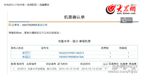截至15日,雙方幾乎沒有任何微博“舉證”,事情似乎戛然而止。但16日晚8:27的一條微博信息,讓更多網友將此事與南航空姐和南航牽連在一起。一名叫做“@未來的PILOT”的微博網友不僅將南航空姐的生活照與“@扣腳女漢”的照片公布出來并放到一起,還上傳一張兩人在事發當天的“機票確認單”,確認單上明確注明了兩人的姓名(吳某某和張某某)、證件號、訂單號、航程、航班號、出發城市、到達城市、起飛時間、到達時間等詳細信息。