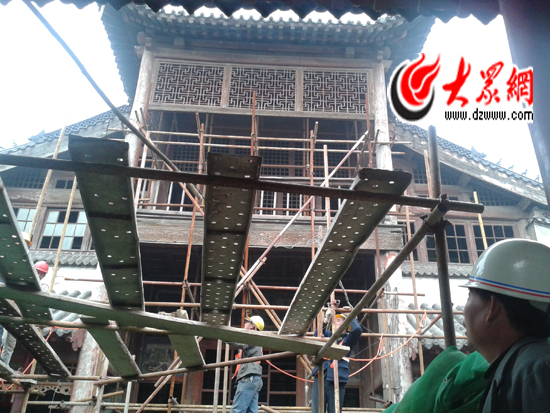 工人們正在搭建腳手架,準備對題壁堂進行修繕。大眾網記者 李兆輝 攝