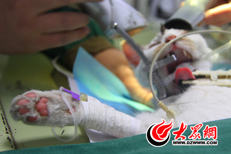 隨后,花花身上被醫生夾滿了監測血壓、心跳、呼吸的小夾子,前肢被接上輸液器,嘴巴也被緊緊固定住,并插入一根輸送氧氣的管子。隨著麻醉藥慢慢見效,原本還略作掙扎的花花逐漸合上眼睛,不動了。