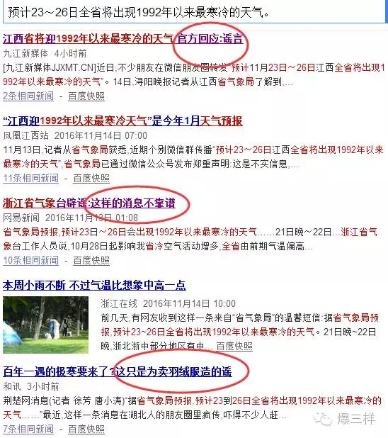 在調查過程中,大眾網記者發現,同樣的事,在最近幾天,也曾先后被江西省氣象臺、湖北省氣象臺和浙江省氣象臺緊急辟謠:“不要相信和傳播我省近期有極寒天氣的不實信息,氣象臺一般不會發布10天以后的預報,請大家不要相信這類謠言。”