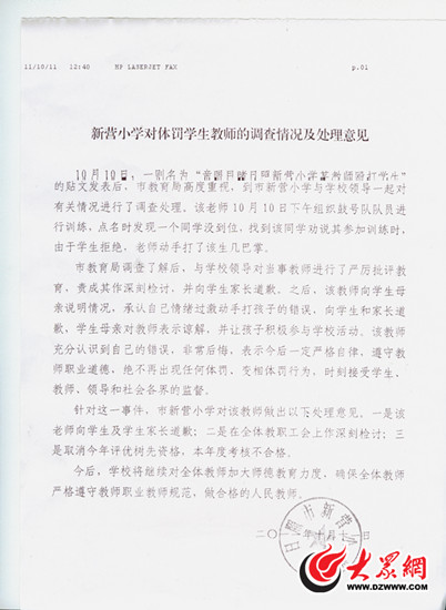 10月11日中午13時許,大眾網接到日照新營小學對于該事件處理意見的公函——《新營小學對體罰學生教師的調查情況及處理意見》,公開了學校對此事件的調查結果。