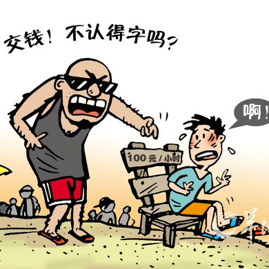 近日,一名網友和同學去煙臺實習時,到煙臺金沙灘“隆順海上樂園”游玩,同學在海灘板凳上坐了2分鐘都不到,“一個大哥過來就要收一百塊錢,不給錢就要扣人,旁邊站了幾個小混混似的人物”,最后給了100塊錢才脫身。原來,這個破木頭板凳居然明碼標價“100元/小時”。