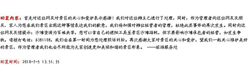 記者了解到,7月5日,煙臺開發區旅游局在對網友投訴的回復中終于公開道歉。記者在7月5日下午煙臺開發區旅游局的網上市民對話中看到,該局對在金沙灘景區中遭遇經營攤主亂收費的網友回復中表示:我們(旅游局)對這位攤主已進行了處理,同時,“作為管理者向這位網友及朋友、家人為您在我們景區出現這種事情表達我們的歉意,我們將加強對攤位經營者的管理,杜絕此類事件的再次發生!