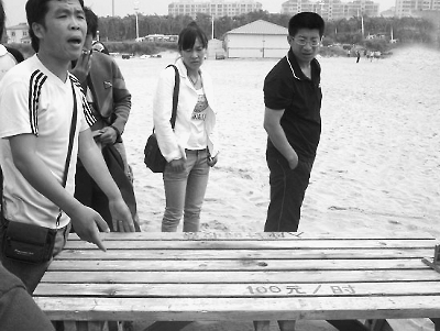 煙臺(tái)開(kāi)發(fā)區(qū)4A級(jí)景區(qū)——金沙灘海水浴場(chǎng),幾塊木頭板子搭起了板凳,居然明碼標(biāo)價(jià)“100元/小時(shí)”。