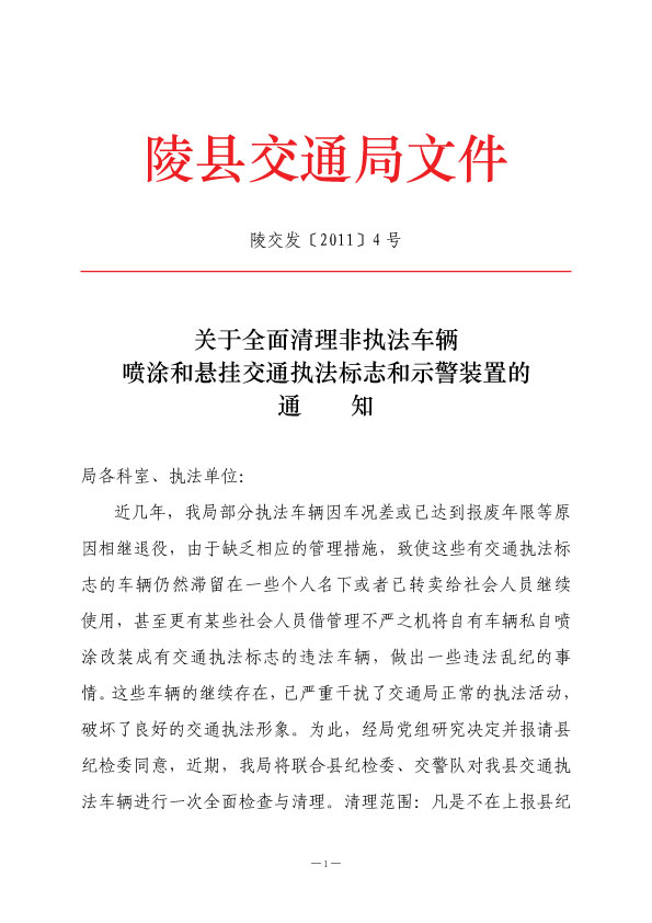 記者看到,在陵交發【2011】4號《關于全面清理非執法車輛噴涂和懸掛交通執法標志和示警裝置的通知》中,該局規定,現有執法車輛凡是不在上報縣紀檢委《陵縣交通局執法車輛名單》的交通執法標志車輛均在清理范圍之內;清理措施:查扣所有違法車輛,依據有關法律法規進行處理,并對相關責任人(交通局行政人員)給予行政處分,觸犯法律的移送司法機關處理。
