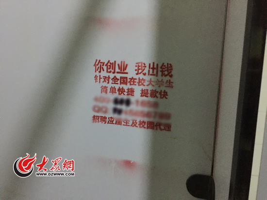 4月11日,大眾網(wǎng)記者來(lái)到濟(jì)南長(zhǎng)清大學(xué)城商業(yè)街,在部分路段,幾乎每走十幾米就能到校園貸款的廣告。這些廣告有的是制作精良的海報(bào),有的是手寫(xiě)的“牛皮癬”,即使在商場(chǎng)的公廁里,坑位前的隔板上也或手寫(xiě)、或噴繪地分布著貸款廣告。這些廣告留下的多是微信、QQ號(hào)碼等聯(lián)系方式,很多只是一個(gè)二維碼,只要“掃一掃”就能借款。
