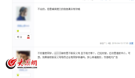 一名大學(xué)生在某網(wǎng)貸平臺(tái)的官方貼吧里咨詢是否會(huì)聯(lián)系家長(zhǎng)和老師,一位疑似該平臺(tái)員工回答稱,不會(huì)聯(lián)系,如果聯(lián)系父母還有同學(xué)申請(qǐng)嗎?