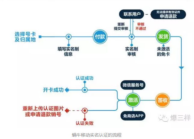 在淘寶網購買手機卡時,除要上傳身份證正反面的照片,還要由本人持身份證拍一張合影上傳;在京東網,購買手機卡必須填寫機主真實姓名和身份證號,在簽收時必須持機主身份證并由派送員拍照留存;在虛擬運營商“蝸牛移動”的官網上,詳細列出了實名認證的流程:在發貨前要進行實名制審核,發貨后激活卡片時還要進行一次認證。