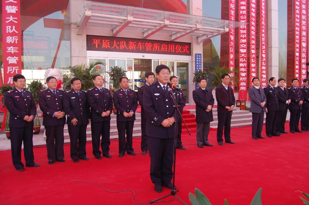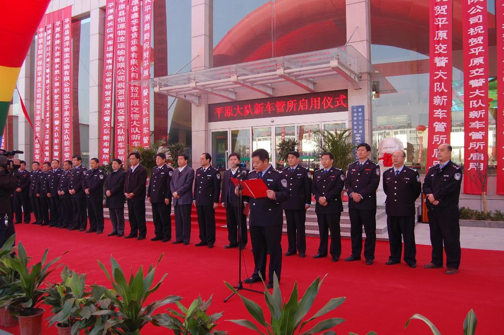 啟用儀式由大隊長黃景波主持;縣委副書記楊杰做賀詞;最后由交警支隊宣布平原大隊新車管所正式啟用。啟用儀式結束后,與會代表在大隊長黃景波的陪同下,視察了新車管所服務大廳,并現場檢查指導業務辦理情況。