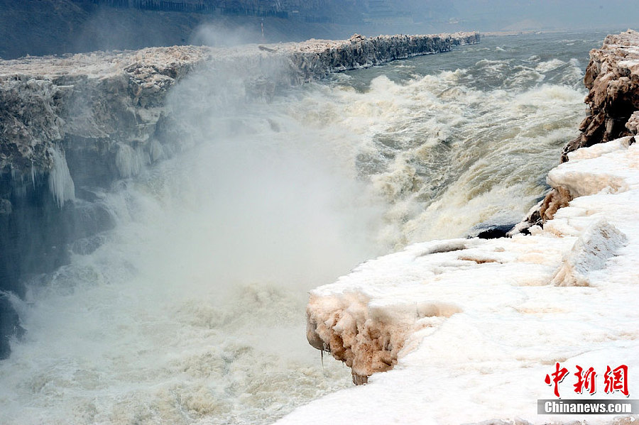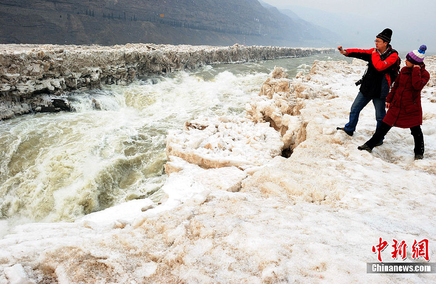 2月12日,來自西安游客站在吉縣一側(cè)黃河壺口冰封撕裂層面上拍照留念。近日,隨著氣溫的回升,封凍月余的黃河壺口瀑布開始消融,形成一條30多米長、10多米寬的壺槽,給初春的壺口瀑布帶來勃勃生機。中新社發(fā)袁景智 攝 圖片來源