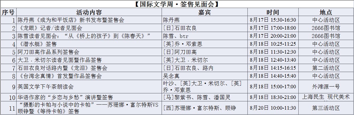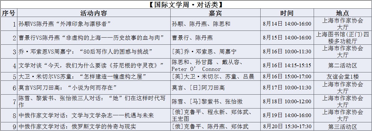 2011年,上海書展在全國首次創立“國際文學周”單元,由書展主辦方、媒體、出版機構等共同邀請國際作家到上海來與讀者交流,這一系列文化活動在書展中得到讀者的認同。今年“上海國際文學周”的主題是“影像時代的文學寫作”,邀請了19位海內外作家和譯者,安排24場活動,形式包括對話、演講、簽售、朗誦等。[更多]