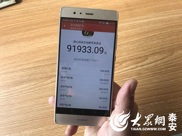 大眾網(wǎng)泰安2月9日訊(記者 付瑩)過(guò)年期間,微信紅包已成為國(guó)人“新寵”,春節(jié)將近尾聲,你收發(fā)了多少個(gè)微信紅包?在山東泰安,就有這么一位網(wǎng)名“良心谷谷主劉孝平”的“紅包哥”,短短一個(gè)月就在陌生網(wǎng)友群里發(fā)出了17736個(gè)紅包,共發(fā)出91933.09元。金額最多時(shí),一天就發(fā)了近4萬(wàn)元。”一位偶然進(jìn)入“良心谷”紅包群的網(wǎng)友告訴記者,春節(jié)短短七天,最多的一天就搶了“谷主”800元紅包,“我摸清了他發(fā)紅包的規(guī)律,每天等著,為了搶紅包,大年三十都沒(méi)顧得上和爸媽好好說(shuō)話。”還有一位網(wǎng)友在打開(kāi)支付寶的積“福”開(kāi)獎(jiǎng)后,看到中獎(jiǎng)金額,感嘆“谷主比馬云對(duì)我們好”。