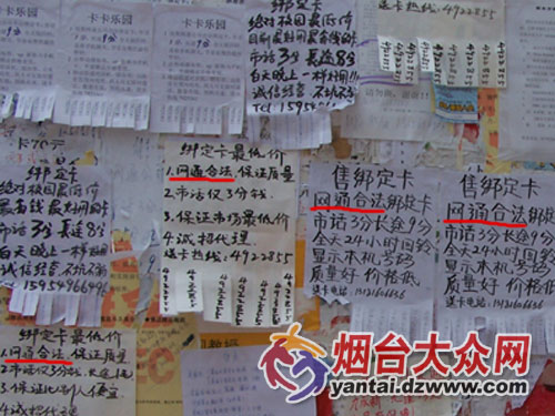 煙臺大眾網5月15日訊(記者 于偉偉)連續接到幾起關于電話回撥卡的投訴后,記者5月15日來到在煙臺售卡較多的幾所大學。在校園里記者看到,幾乎各個宣傳欄里都貼滿了銷售綁定回撥卡的廣告,還有不少招綁定回撥卡代銷的廣告。這種卡大致分為靈通地帶卡、智能一號通、落基地帶、市話如意行等幾種,有的廣告中竟稱是網通合法綁定卡。