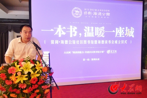 在今天的落成儀式上,大眾網董事長、總經理林忠禮表示,今年是山東網絡文化建設重點發展的一年,也是大眾網普及文化閱讀的實施年。作為山東省首個社區讀書館,保利海德公館社區讀書館的落成,既是新聞媒體發揮橋梁紐帶作用,搭建文化建設平臺的重要成果,也是保利海德公館注重社區文化建設、提升社區人文素養的重要體現。