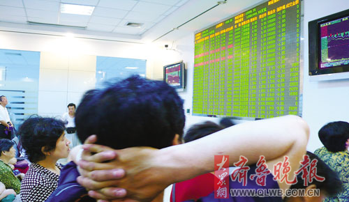 。常叭,在濰坊一證券交易大廳內,面對滿盤皆綠的大盤,部分股民直撓頭。 本報記者 周青先 攝
