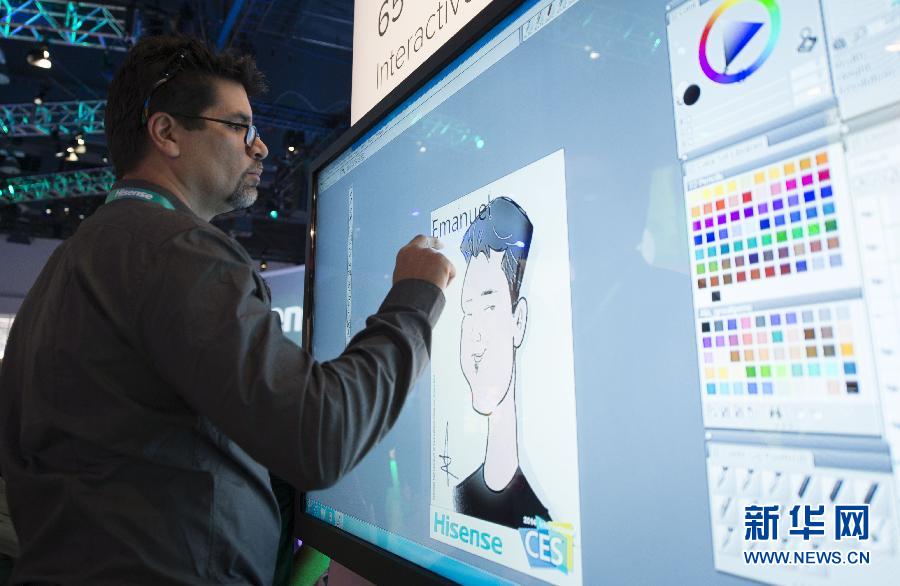 1月8日,在2014年拉斯韋加斯國際消費電子展上,一名工作人員在海信公司的觸屏電視上繪畫。 2014年國際消費電子展于7日在拉斯韋加斯正式開幕,眾多中國企業精彩亮相。 新華社記者楊磊攝