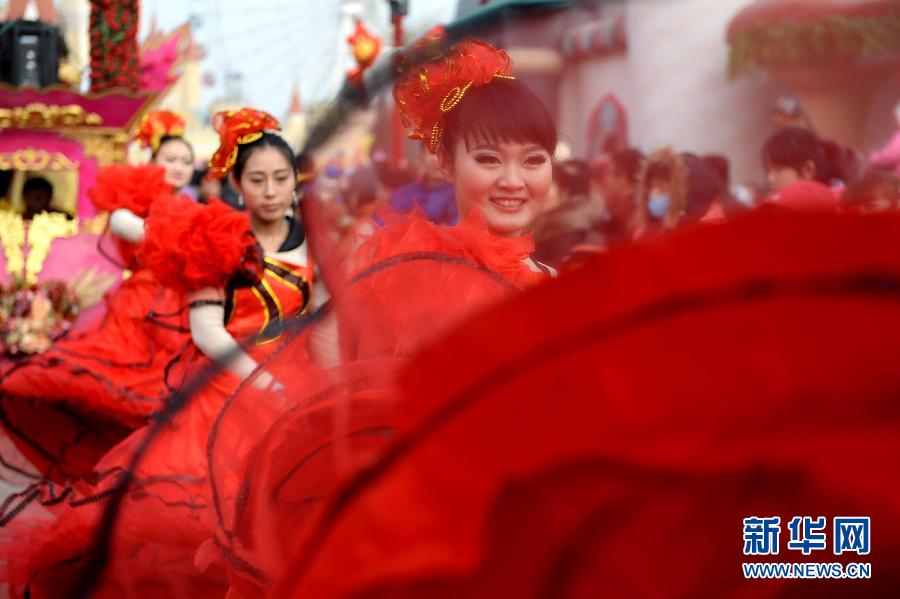 2014年1月31日,參加花車巡游的舞蹈演員為游客表演。當日,2014年北京石景山游樂園“迎春洋廟會”拉開序幕。洋廟會以“駿馬奔騰躍新春闔家歡樂逛廟會”為主題,將傳統民俗節慶集會活動與西洋游樂文化活動相結合,推出美食、購物、表演、娛樂、游藝、游園等娛樂活動內容。新華社記者李俊東攝