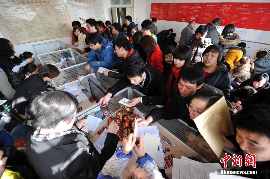 1月3日,山西太原婚姻登記處,新人排隊(duì)登記結(jié)婚。當(dāng)日日期“2014年1月3日”諧音“愛(ài)你一世一生”,因此成為中國(guó)許多新人熱捧的特殊節(jié)日,多數(shù)年輕人選擇在這一天結(jié)婚或領(lǐng)證。中新社發(fā) 韋亮 攝