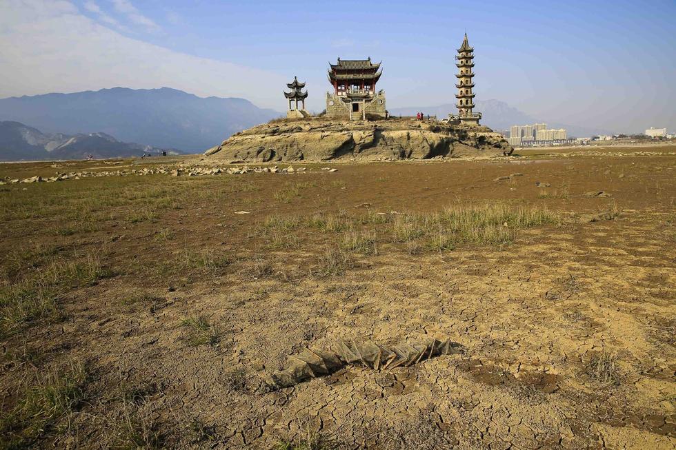 2015年1月3日,江西省九江市星子縣,受上游來水減少和久旱少雨的影響,我國第一大淡水湖鄱陽湖逼近極枯水位,江西省星子縣標(biāo)志性景觀落星墩“水落石出”,豐水期需要渡船才能前往觀景臺,現(xiàn)在步行就可以到達(dá),吸引了游人們?nèi)ビ瓮妗?/p>