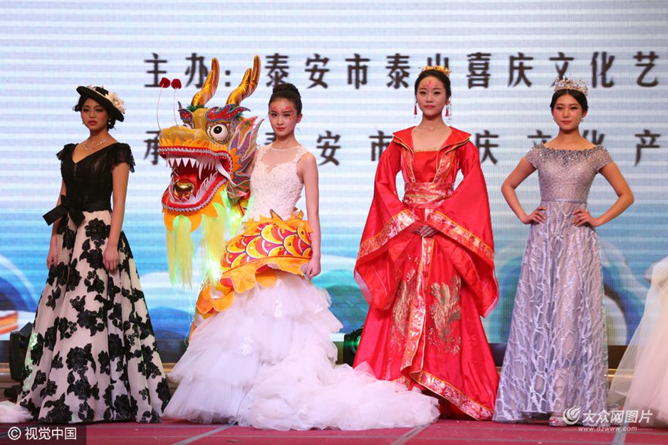 1月19日,山東省泰安市,在一場(chǎng)婚紗禮服走秀現(xiàn)場(chǎng),一名身穿婚紗,身上纏繞著巨龍的時(shí)裝模特在現(xiàn)場(chǎng)走秀驚艷全場(chǎng)。
