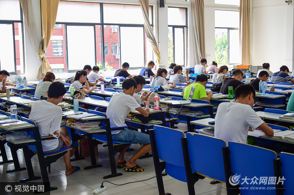 2017年8月22日,山東青島,山東科技大學,時值暑假期間,仍有上千名考研學生堅守在學校,積極備考12月份的全國碩士研究生入學考試。一張張桌子上縱橫交錯的書本筑起一道道 “城墻”,埋頭看書的學生們被湮沒在 “書海”中,其場景就似進入了高三年級的教室,復習的緊張感撲面而來。